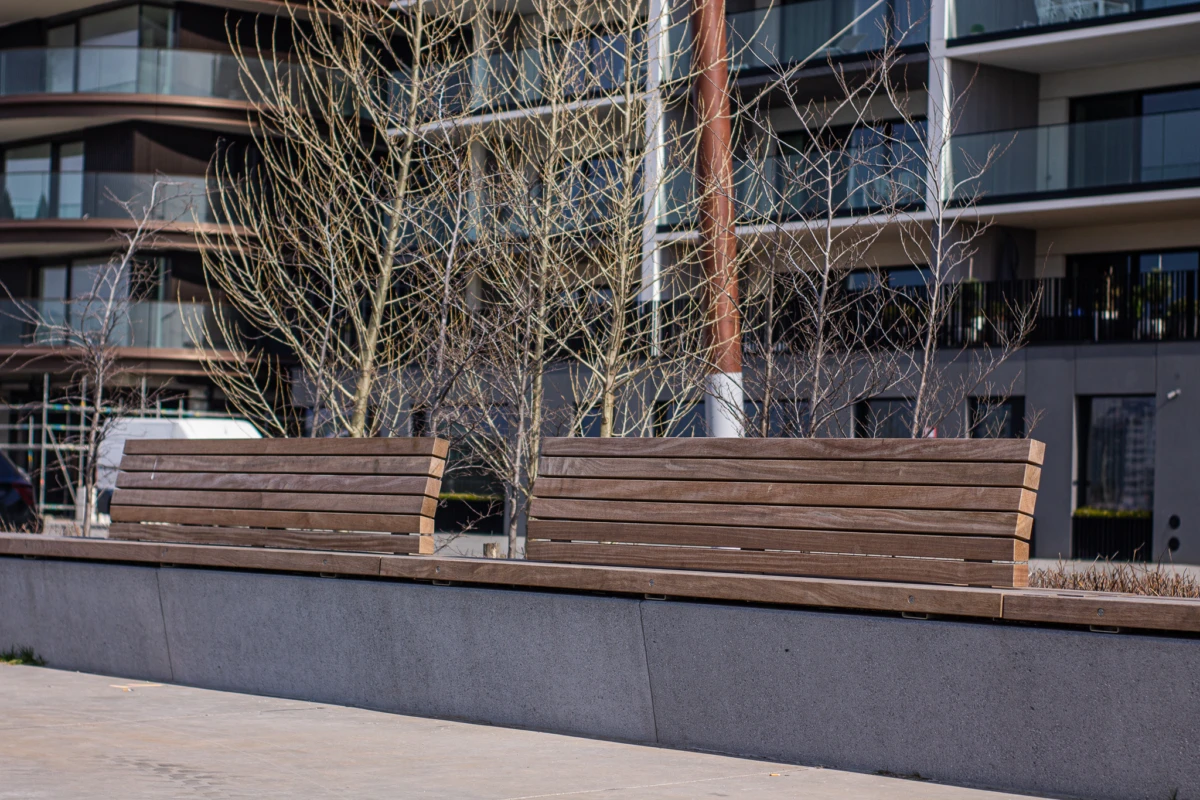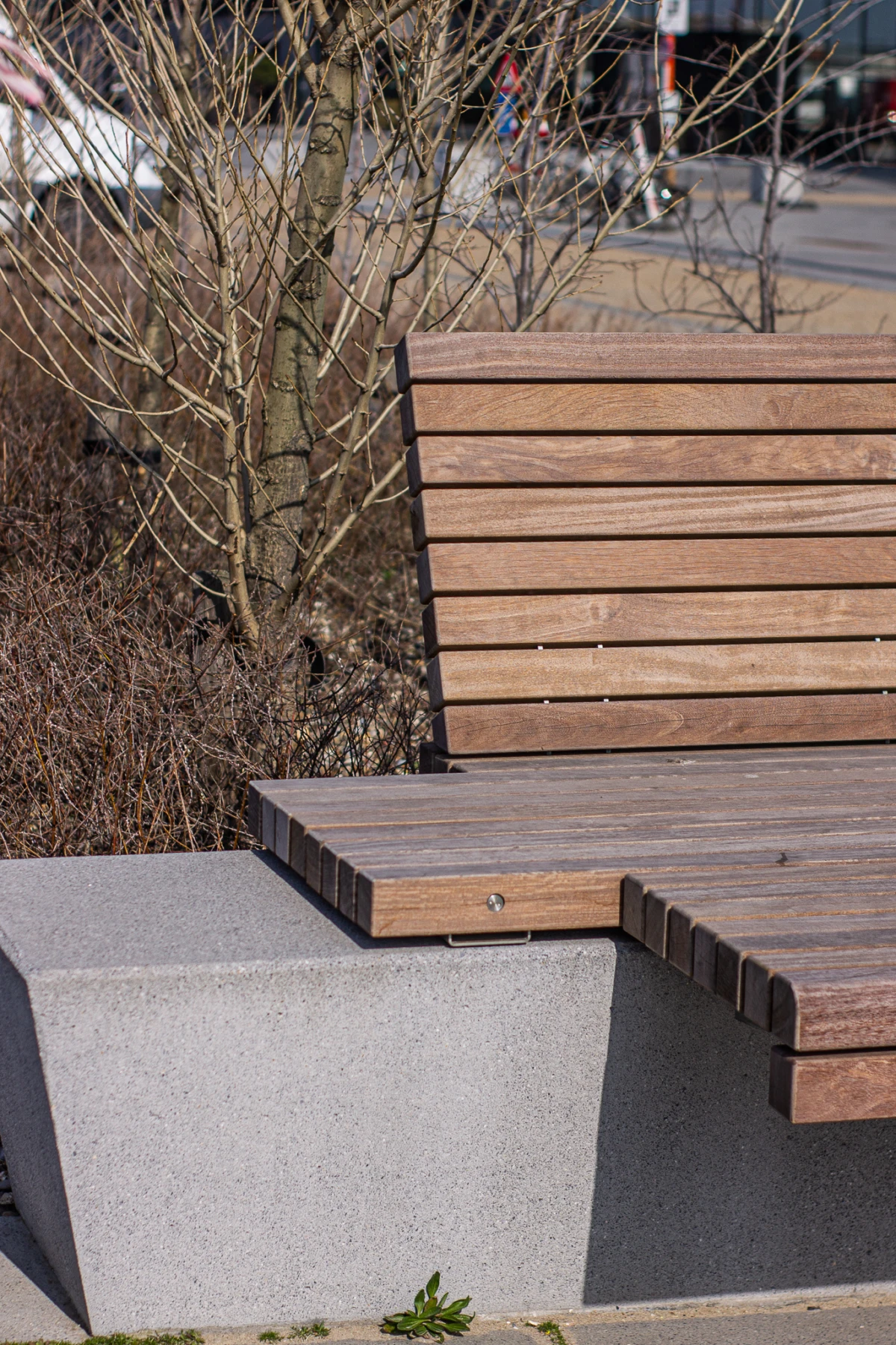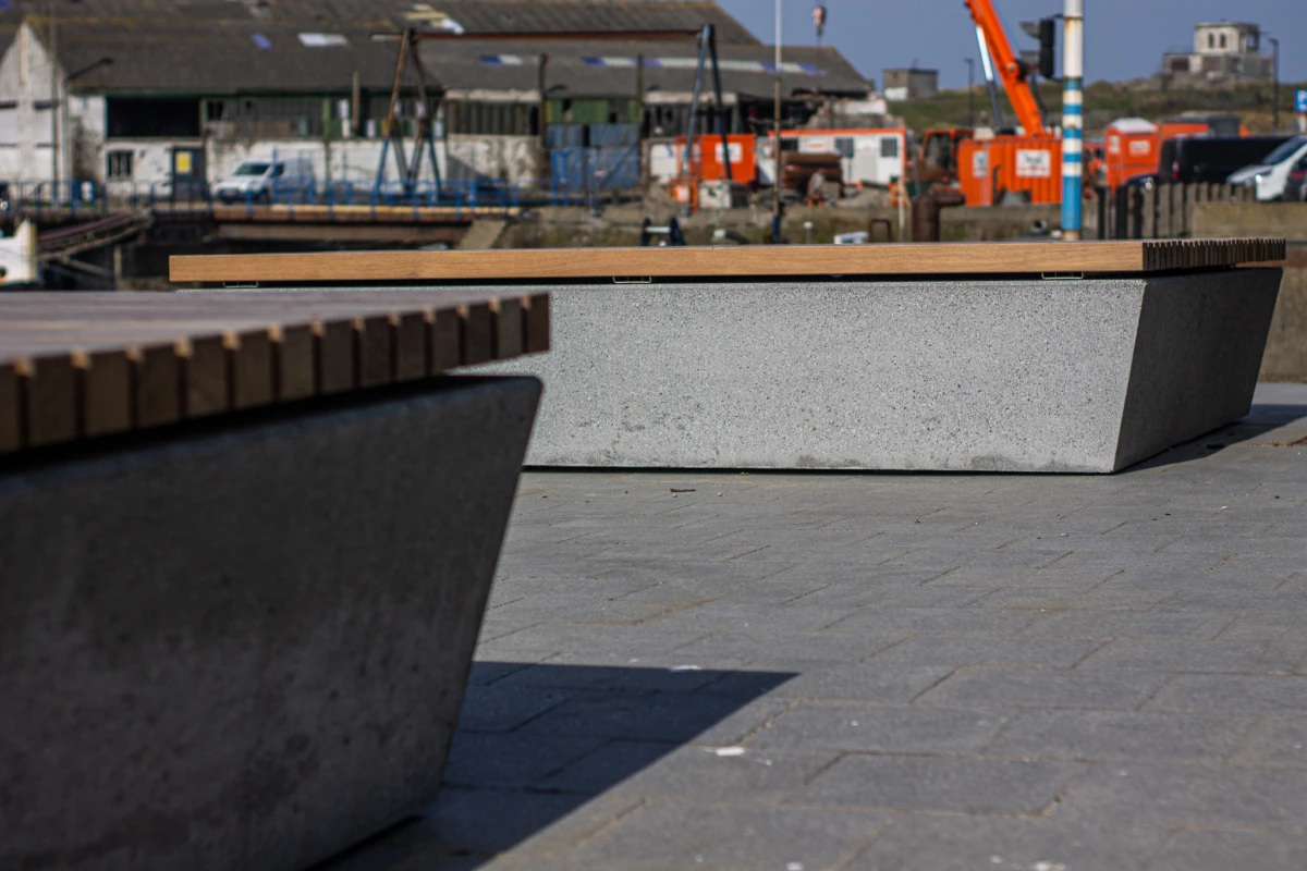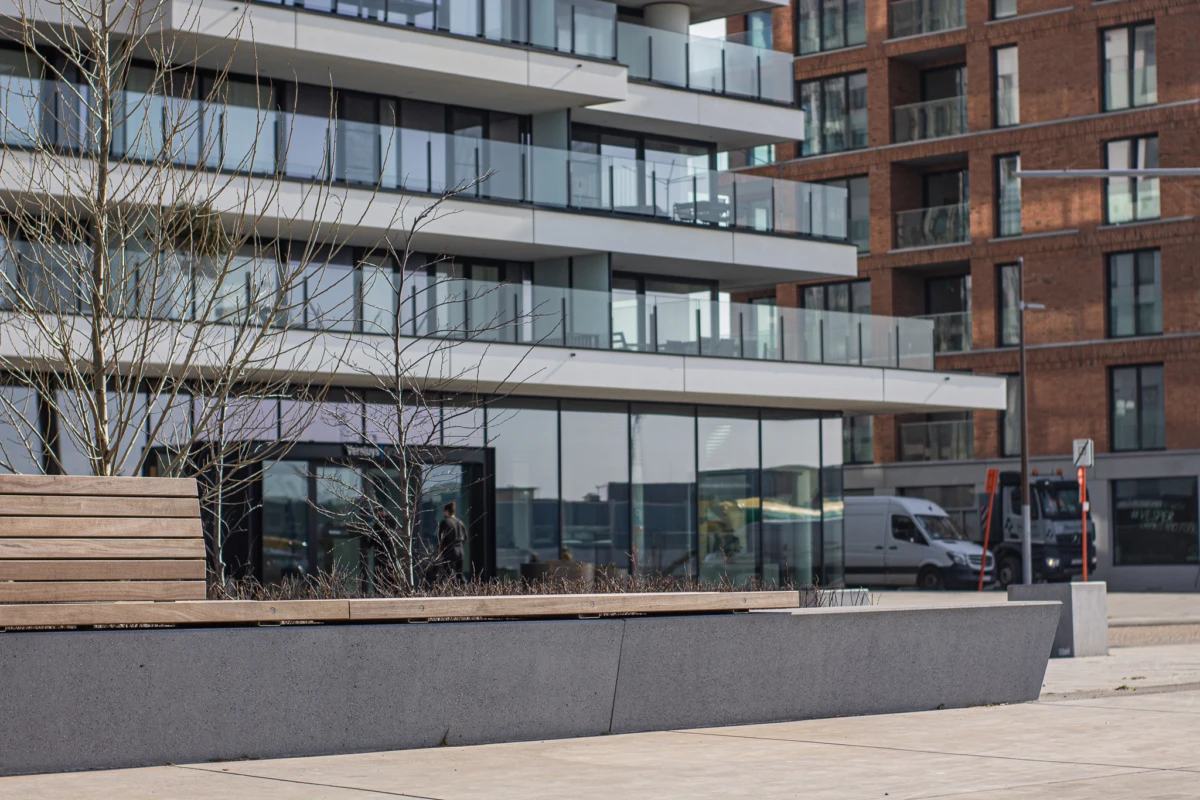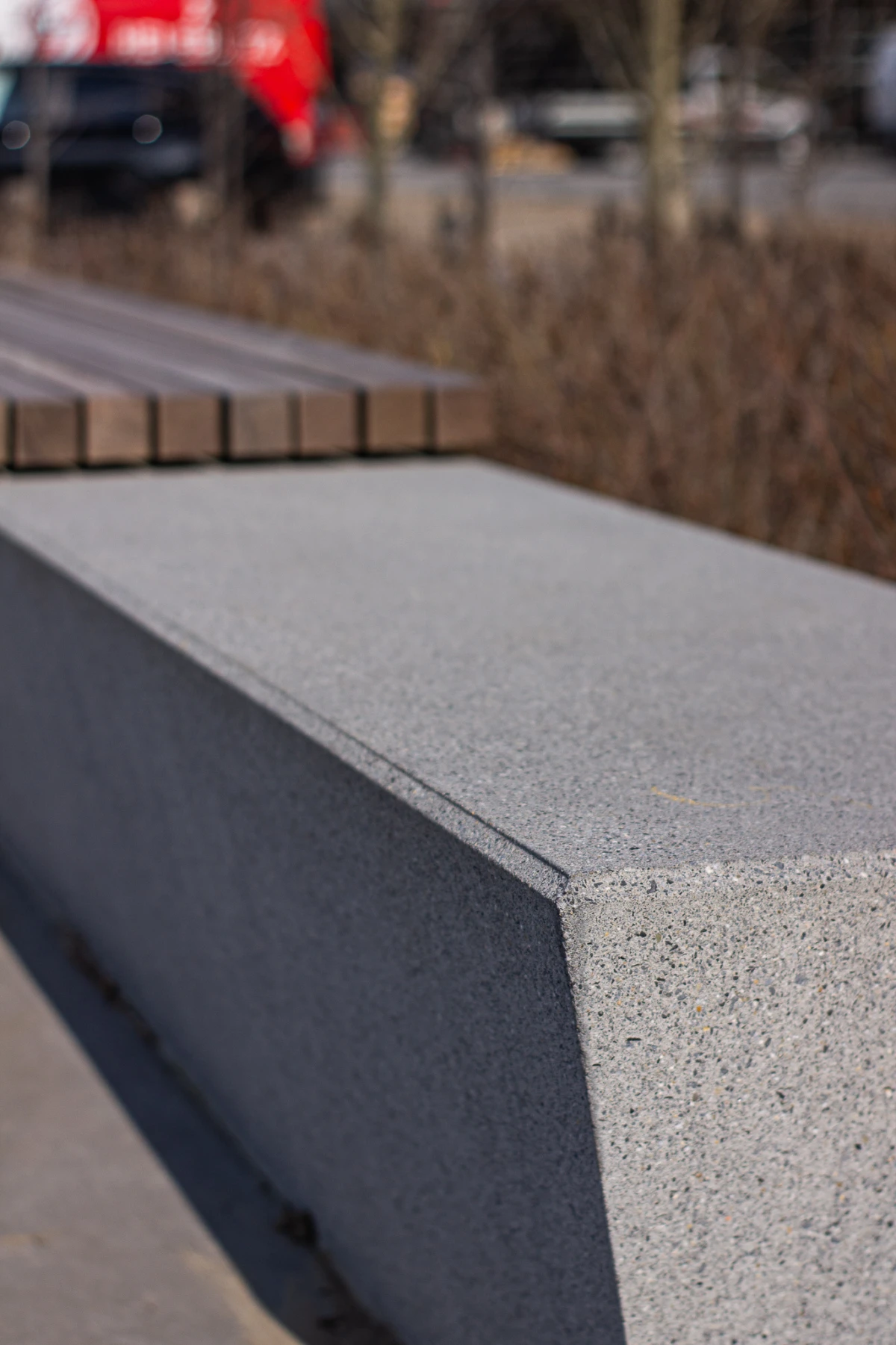 Eerder hebben wij hier alle bestrating en lineaire elementen geleverd. Op de betonnen zitbanken (50x20x100cm) hebben we dezelfde slijtlaag toegepast, waardoor ze identiek zijn aan de betontegels. De banken zijn ook gestaalstraald. In totaal gaat het om ruim 120 meter aan betonnen zitbanken. Ze zijn bekleed met een tropische houtsoort. Doorgaans produceren wij onze betonproducten mechanisch, maar hier is alles handmatig gebeurd, tot het staalstralen toe.